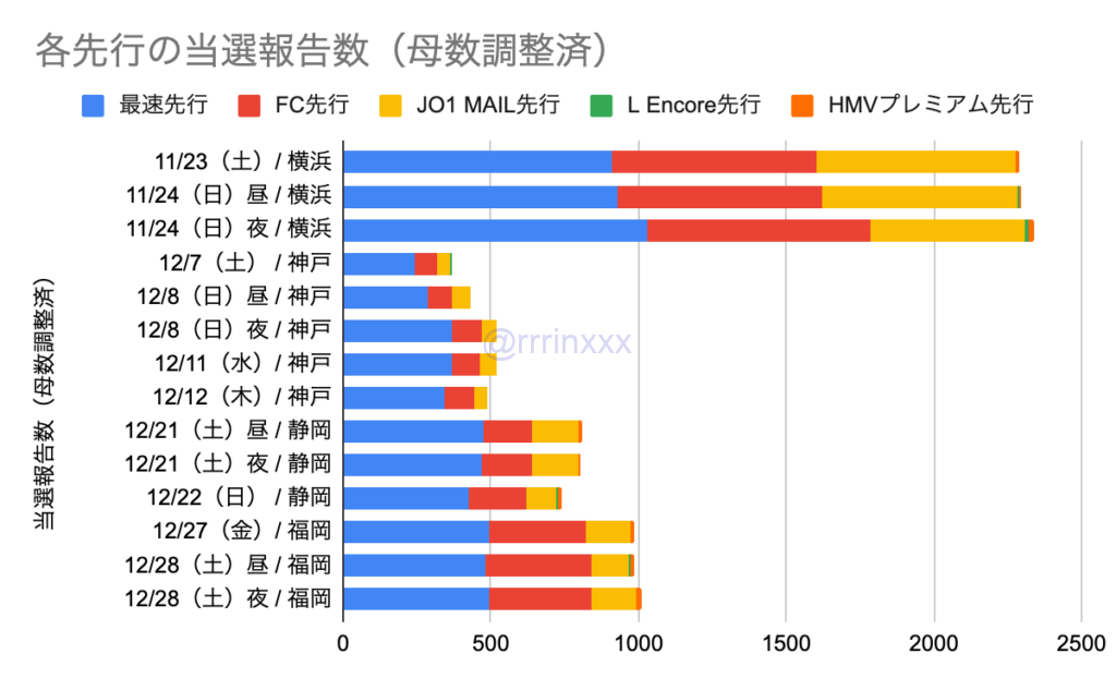 これはLEncore先行同様、神戸での当選報告がないなど、開催地によっての当選率差が激しいことが影響していると考えます。