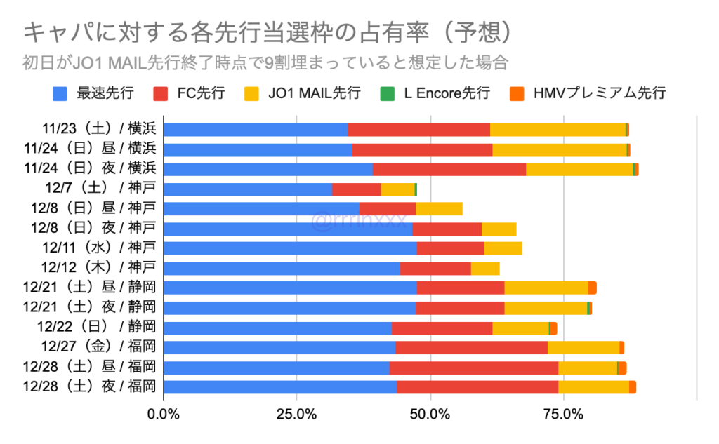 ただ、これは初日がJO1 MAIL先行終了時点で9割埋まっていると仮定した場合ですので、これが実はもっと少ないとなると割合は大きく変わってきます。