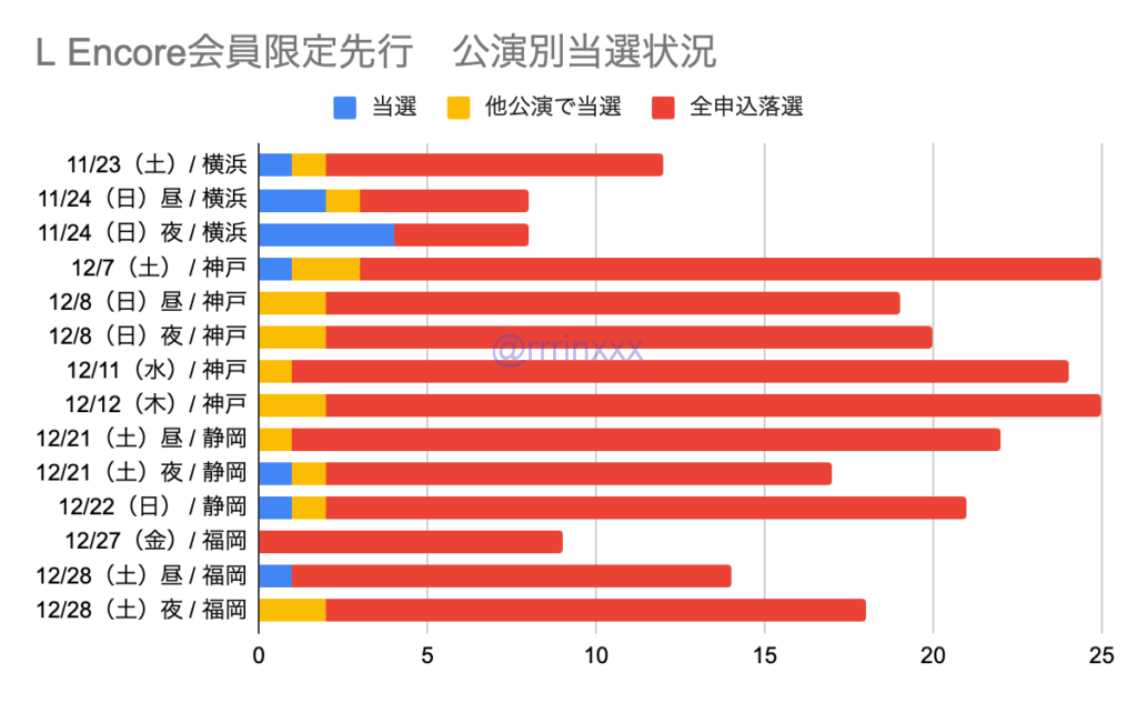 公演別での当選状況は下図の通りです。全体の報告数が少ないためあくまで参考値ですが、LEncore会員限定先行と同様神戸全公演の当選報告はありませんでした。福岡最終公演については当選報告ありました。