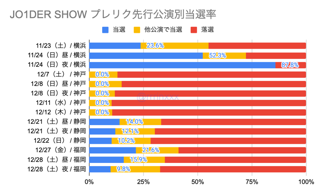 当選率を見ると、最も当選率が高かったのは横浜11/24夜の約9割、最も当選率が低かったのは神戸の0%でした。横浜以外は全体として当選率は低い結果となりました。