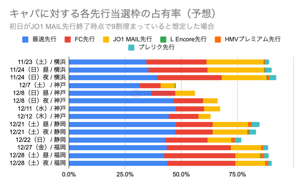 ただ、これは初日がJO1 MAIL先行終了時点で9割埋まっていると仮定した場合ですので、これが実はもっと少ないとなると割合は大きく変わってきます。