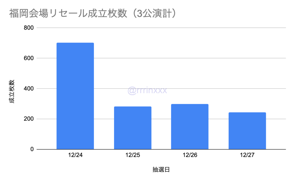 今回、福岡公演のリセール(チケプラトレード)は12/24-27に抽選が行われ、成立枚数は3公演合計で合計1511枚でした。