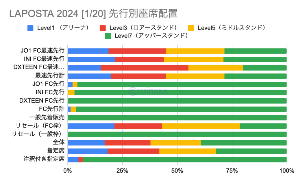 今後の公演の参考のためにこの記事を読まれている方もいらっしゃるかと思いますが、会場によって、また先行種別の割合によっても座席配置は大きく変わるかと思いますので、いつもこうなるとは限らないことをご留意ください。