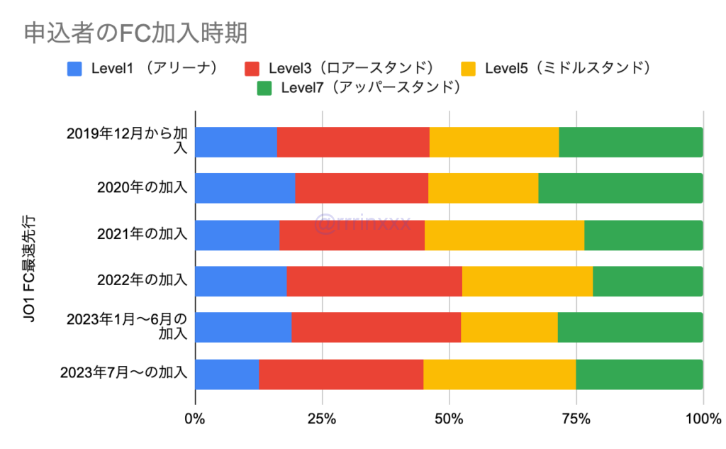 ・申込者のFC加入月:下記はJO1の場合ですがINIも同様の傾向で、2023年7月以降の加入者はそれより前の加入者に比べ、アリーナ率が若干低い傾向でした。ただ23年7月以降は回答数が多くないため、参考程度にお願いします。また、同行者のFC加入月は影響が見られませんでした。