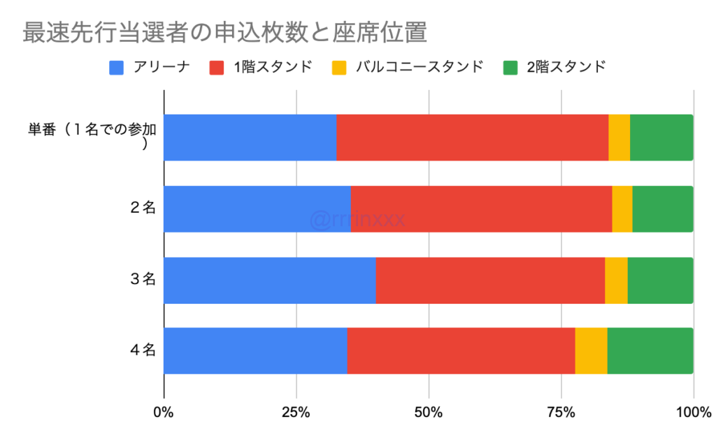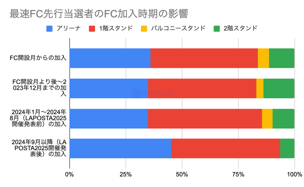 今回、最速先行・FC先行でFC別に受付がありましたが、アリーナ/スタンド共に、当選したグループによる違いはありませんでした。