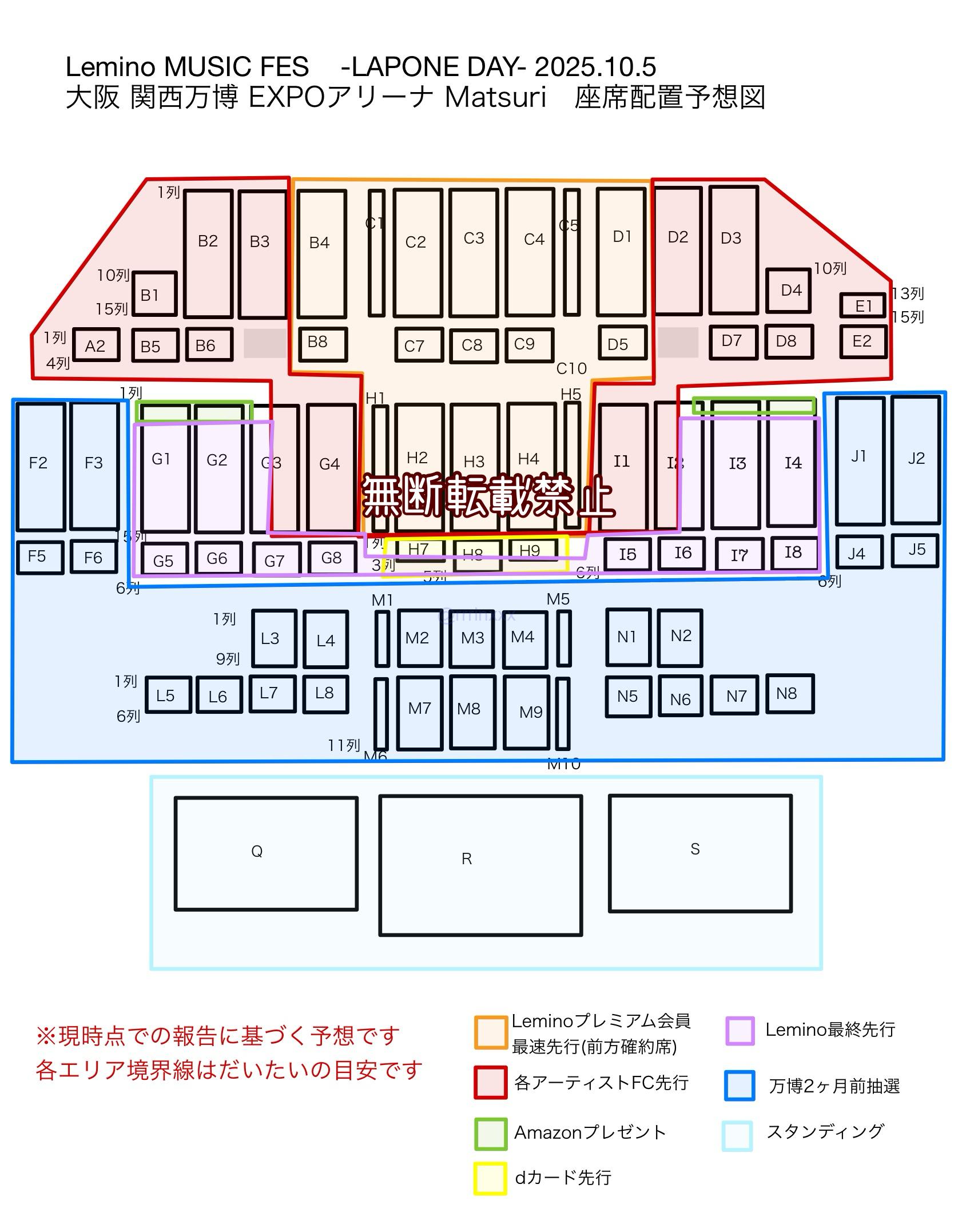 先行など:Leminoプレミアム会員限定最速先行(前方確約席)、各アーティストFC先行、万博2ヶ月前抽選、dカードゴールド会員先行、Leminoプレミアム会員限定最終先行、Amazon/ahamo等プレゼント、ローチケ一般販売