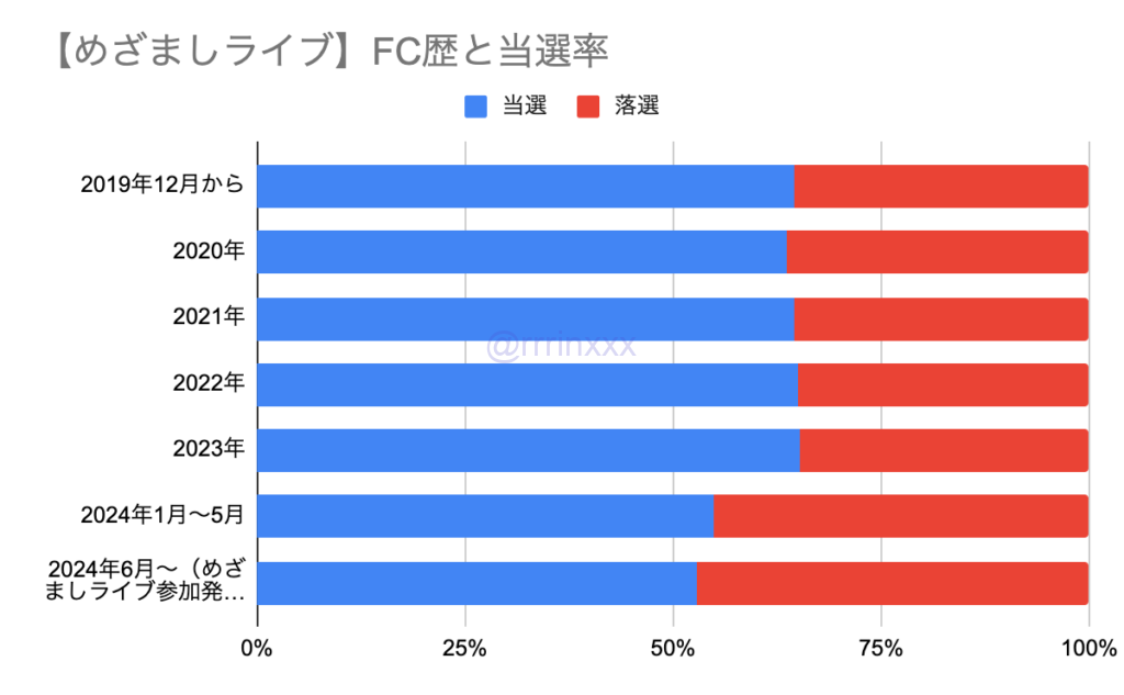昨年はFC先行はなく、通常のぴあプレリザーブ先行のみでしたが、その際の当選率は55%程度でしたので、FC先行となり、1人1枚の申し込みとなったことでやや当たりやすくなった傾向です。