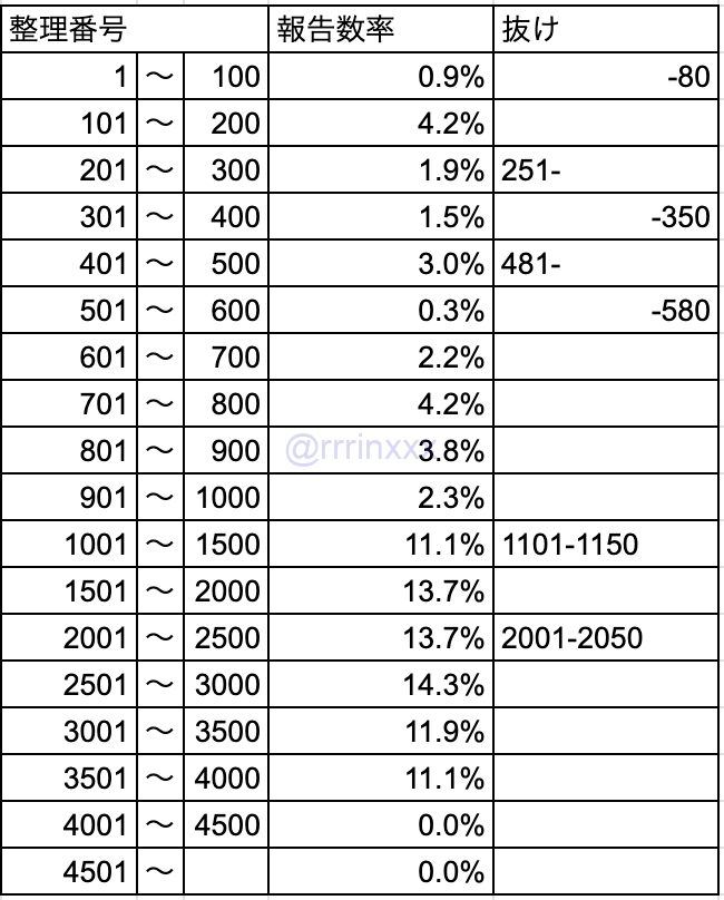 また、1000番以降でも50番単位の抜けは2箇所みられましたが、ここもプレリザーブに割り当てられるか、どういった枠になるのかは不明です。(10番単位の抜けは他にいくつかありましたが記載していません)