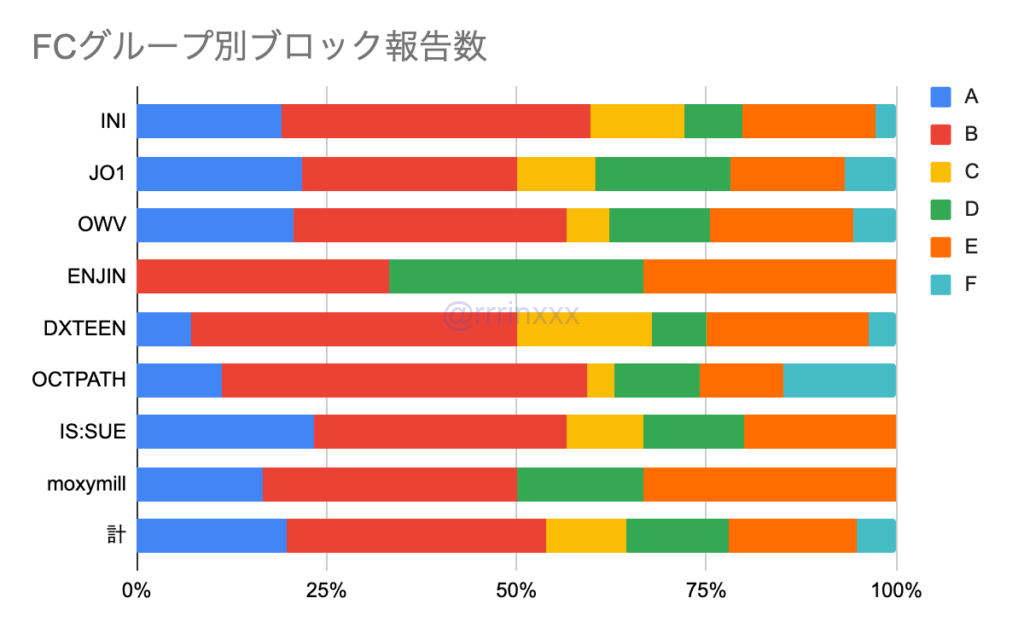INIとJO1を比べると、全体的にINIがBブロックの割合が高いようにみられますが、これは、INI出演日の7/26よりもJO1出演日の7/27の方が、前項記載したとおりBブロック以外の割り当て数が多くなっていたため、相対的にBブロックの割合が少なくなっていたためです。