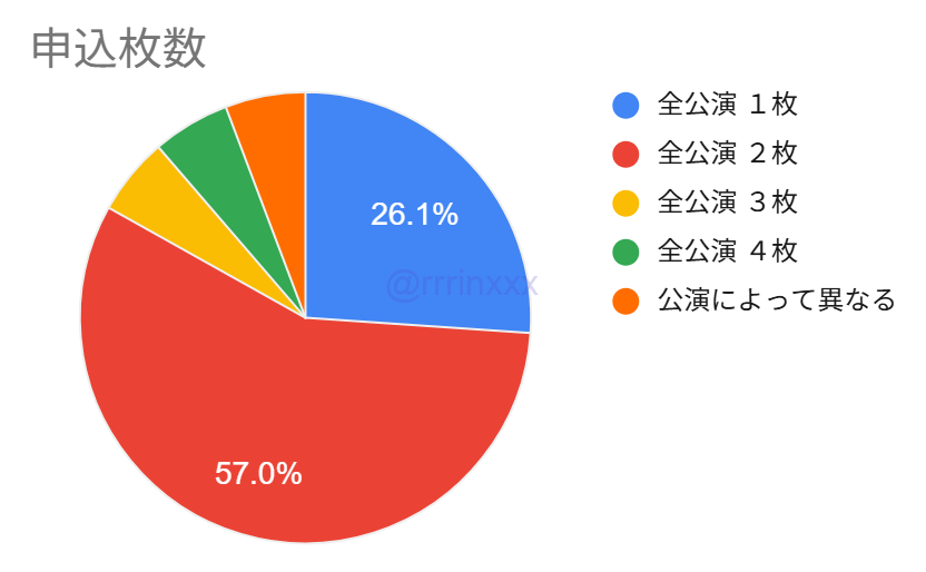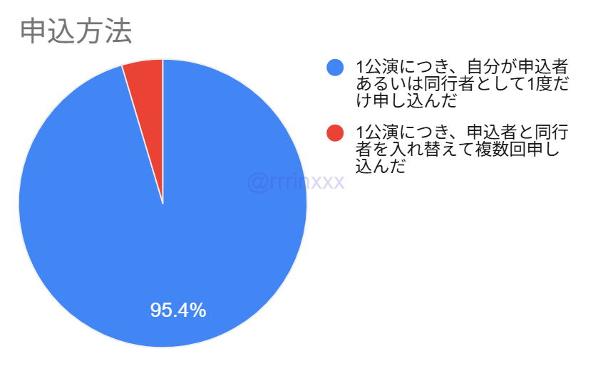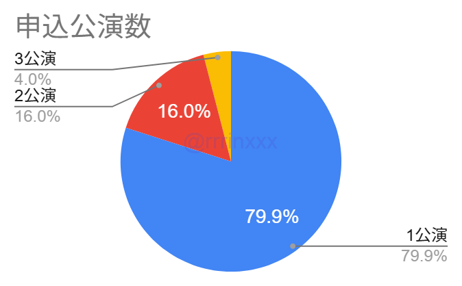 前述の通り、8割の方が1公演のみ申込のため、①のような複数公演の申込をした方は少ないですが、100件程度の当選回答がありました(当選率は複数公演申込のため約10%と低め)。