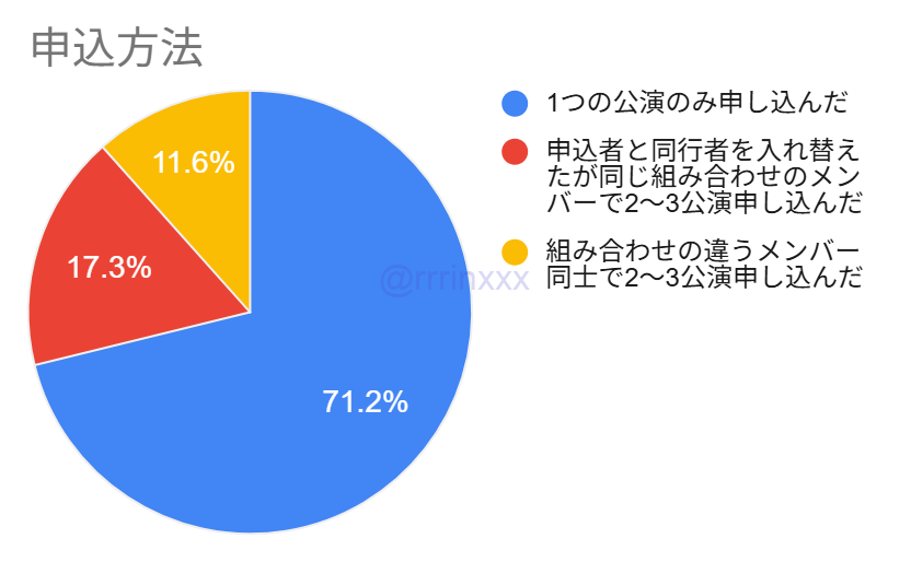 7割の方は1公演のみの申し込みで、残りの3割のうち、申込者・同行者の申込が異なる方法が半分ずつといった形でした。